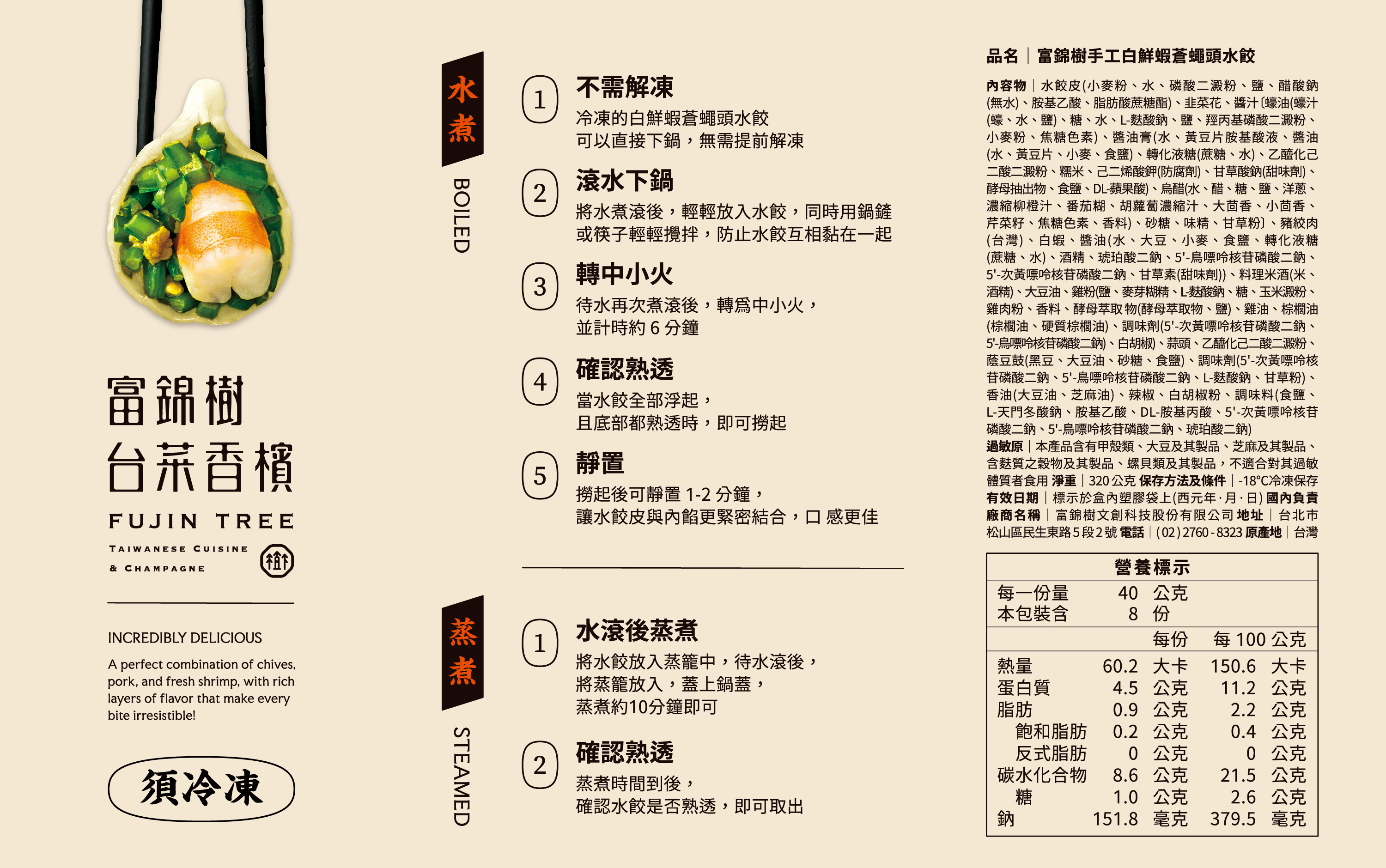 每顆包入整尾厄瓜多白蝦,鮮甜彈牙,搭配彰化溪湖韭菜花、台灣益之豬五花,飽滿扎實、鮮香多汁,滿足大口吃餃子的幸福感。